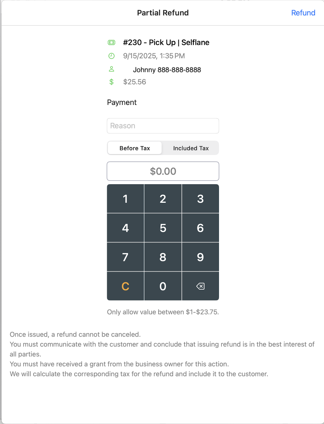You can issue a partial refund to the customer, for example, for missing items. The system will calculate the related tax and add that to the refund.